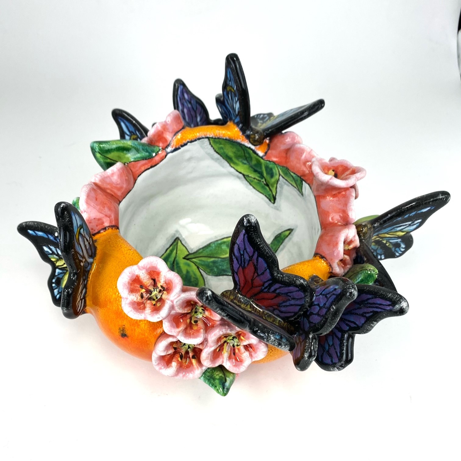 Farraday Newsome is a ceramic artist who creates elaborately glazed terra cotta pottery and sculptures. Her subject matter is primarily drawn from nature, often referring to the emotional and metaphorical allusions found in the natural world. Newsome has worked within the format of the vessel for forty years, exploring ideas of abundance, time, and fertility. Newsome grew up in the redwood forests of California, earning her BA in Biology from the University of California at Santa Cruz and her Masters in Art with a Ceramics Emphasis at San Francisco State University. She lives in Mesa, Arizona, sharing a studio with her husband and fellow artist Jeff Reich.